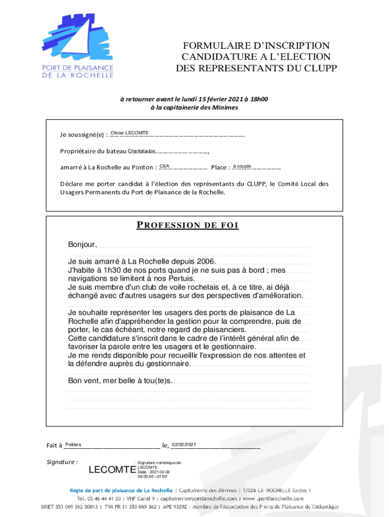 FORMULA IRE INSCRIPTION CANDIDATURE A ELECTION DES REPRESENT ANTS DU CLUMP returner savant LE Lundy 15 frier 2021 18h00 la capitainerie DES MinimesOlivier BECOME JE sous sign(e) :. Proprietary Du