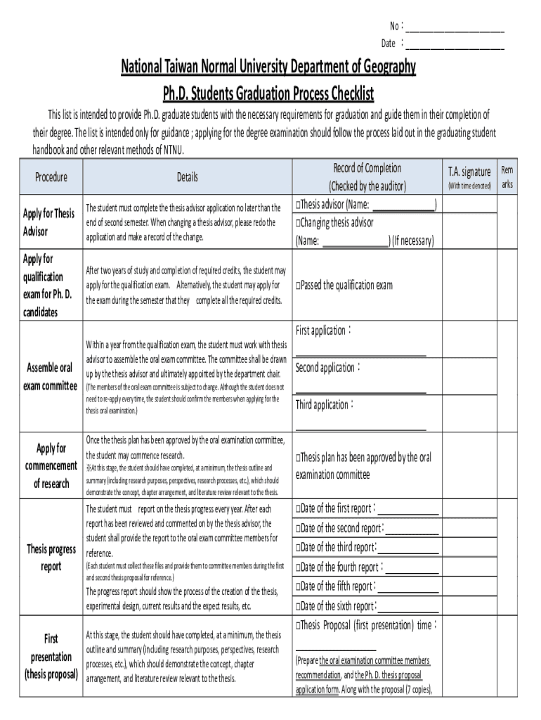 No___ Date ___National Taiwan Normal University Department of Geography Ph.D. Students Graduation Process Checklists list is intended to provide Ph.D. graduate students with the necessary requirements