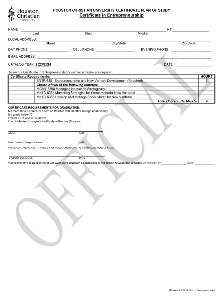 HOUSTON CHRISTIAN UNIVERSITY CERTIFICATE PLAN OF STUDYCertificate in Entrepreneurship NAME: ___ H# ___ Last First Middle LOCAL ADDRESS: ___ Street City/State Zip Code DAY PHONE: ___CELL PHONE: ___EVENING