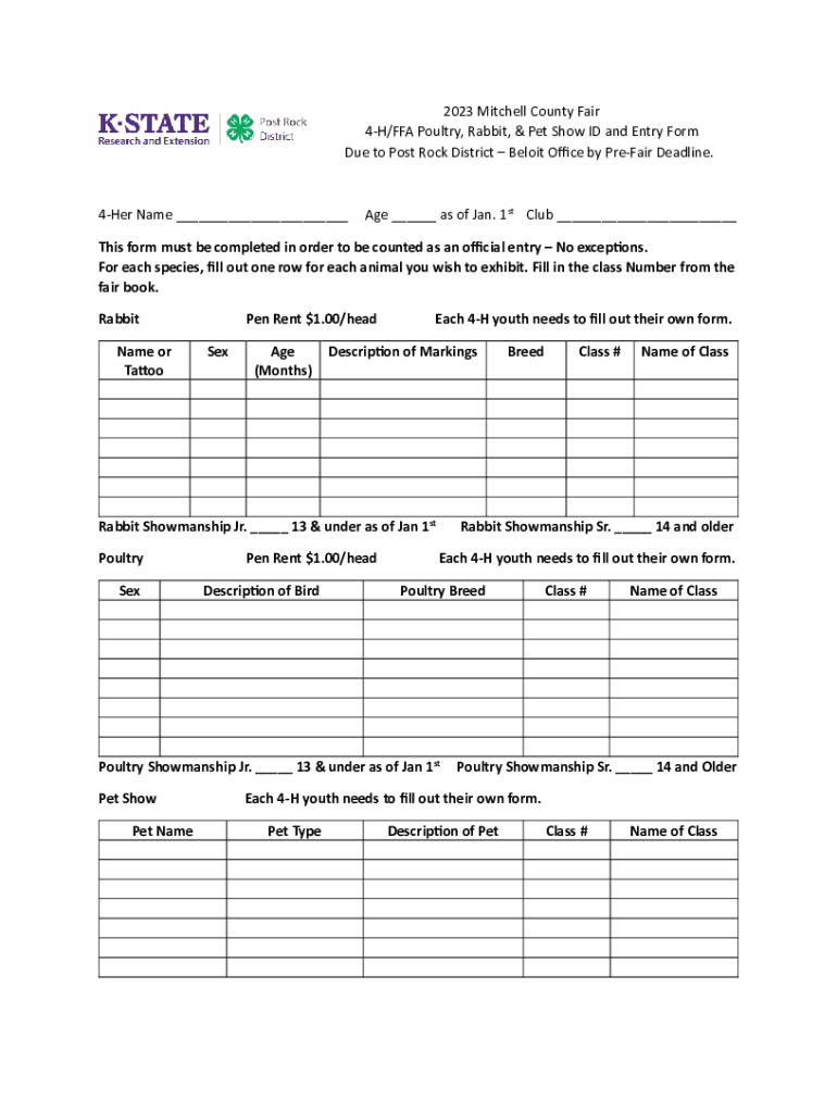 2023 Mitchell County Fair 4H/FFA Poultry, Rabbit, & Pet Show ID and Entry Form Due to Post Rock District Beloit One by Prepare Deadline.4Her Name ___Age ___ as of Jan. 1st Club ___This form must be