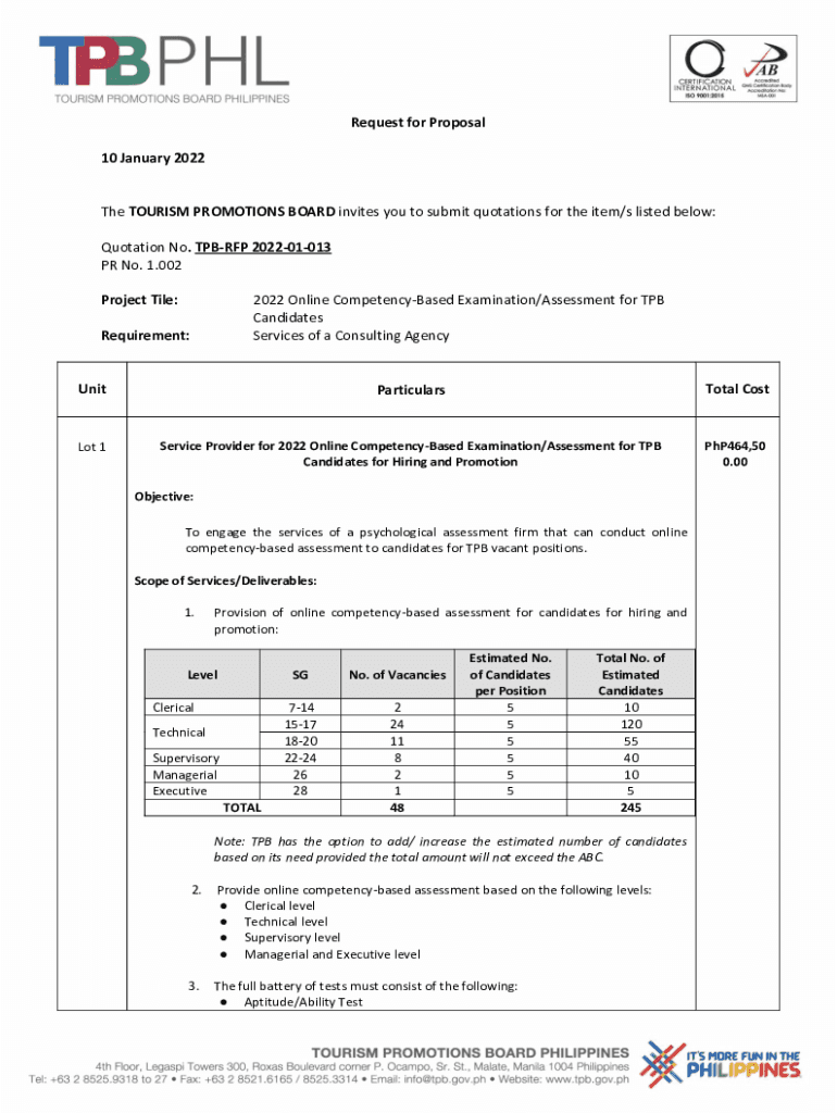 10 January 2022The TOURISM PROMOTIONS BOARD invites you to submit quotations for the item/s listed below: