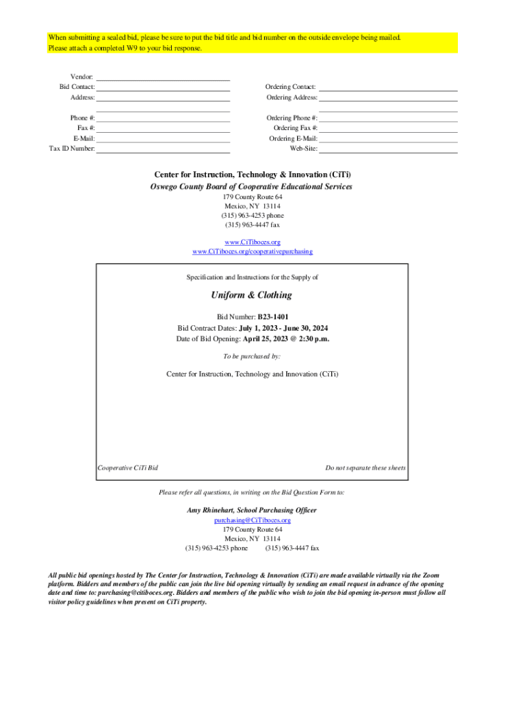 Create bid documents outlining the requirements and specifications for the uniforms and clothing.