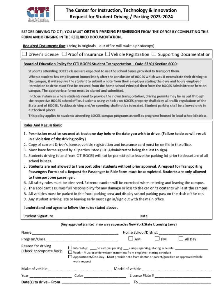 The Center for Instruction, Technology & Innovation Request for Student Driving / Parking 20232024 BEFORE DRIVING TO CITY, YOU MUST OBTAIN PARKING PERMISSION FROM THE OFFICE BY COMPLETING THIS FORM