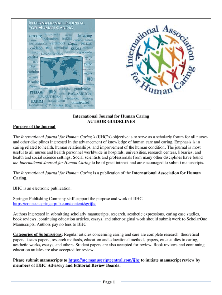 International Journal for Human Caring AUTHOR GUIDELINES Purpose of the Journal The International Journal for Human Caring (IHS) objective is to serve as a scholarly forum for all nurses and other
