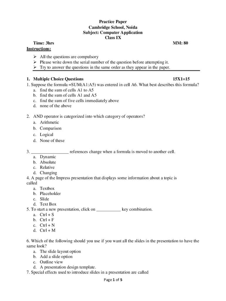 Practice Paper Cambridge School, Noida Subject: Computer Application Class IX Time: 3hrs Instructions:MM: 80 All the questions are compulsory Please write down the serial number of the question before
