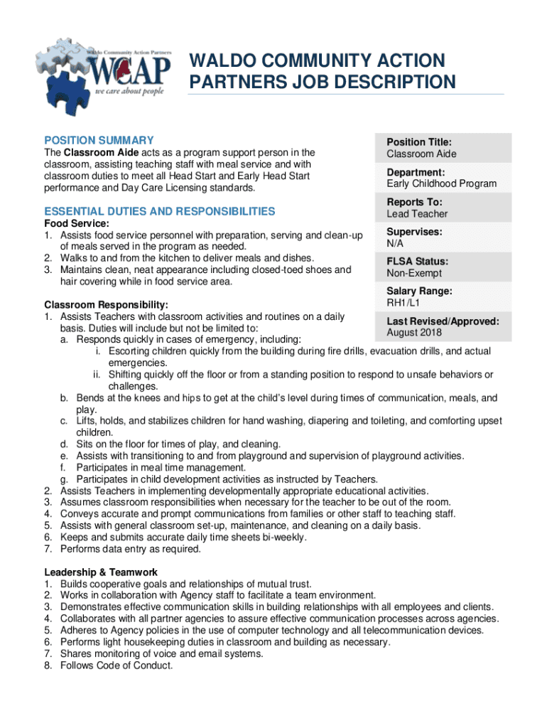 WALDO COMMUNITY ACTION PARTNERS JOB DESCRIPTION POSITION SUMMARY The Classroom Aide acts as a program support person in the classroom, assisting teaching staff with meal service and with classroom