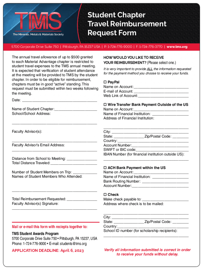 The Minerals, Metals & Materials SocietyStudent Chapter Travel Reimbursement Request Form5700 Corporate Drive Suite 750 | Pittsburgh, PA 15237 USA | P: 17247769000 | F: 17247763770 | www.tms.orgThe