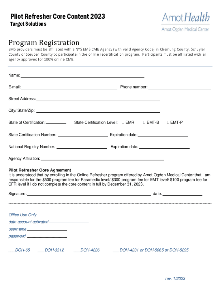 Pilot Refresher Core Content 2023 Target SolutionsProgram Registration EMS providers must be affiliated with a NYS EMS CME Agency (with valid Agency Code) in Che mung County, Schuyler County or Steuben