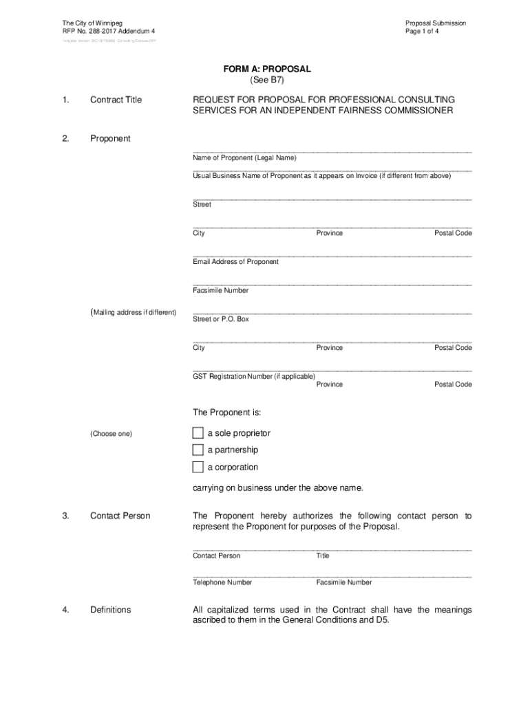 The City of Winnipeg RFP No. 2882017 Addendum 4Proposal Submission Page 1 of 4Template Version: SrC120150806 Consulting Services REFORM A: PROPOSAL (See B7) 1. Contract Title2. ProponentREQUEST FOR