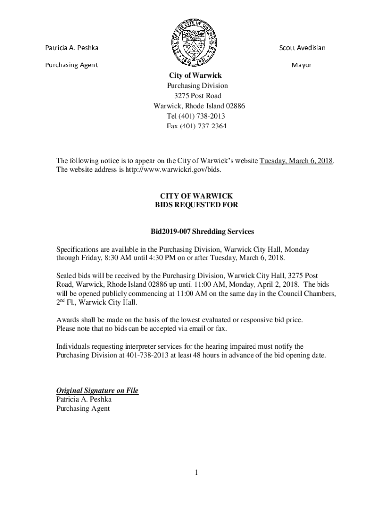 Patricia A. PeshkaScott AvedisianPurchasing Aventador City of Warwick Purchasing Division 3275 Post Road Warwick, Rhode Island 02886 Tel (401) 7382013 Fax (401) 7372364The following notice is to appear