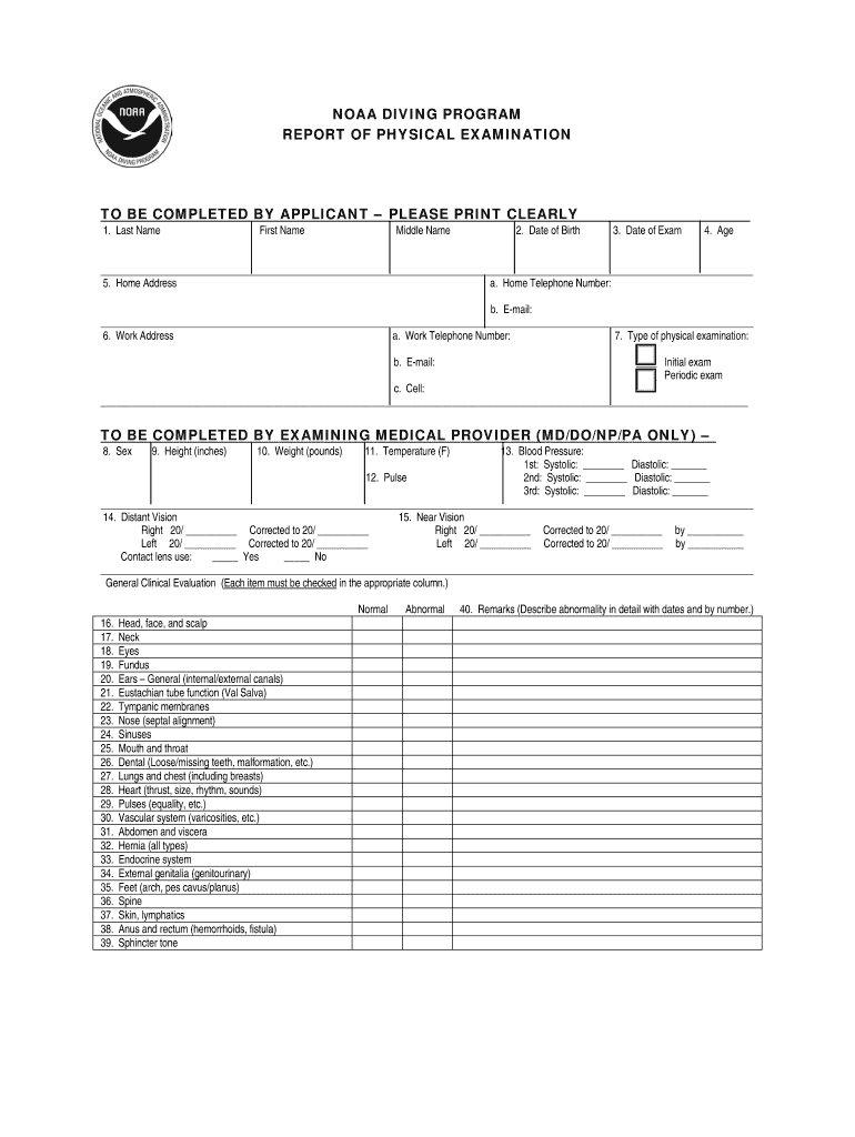 NOAA DIVING PROGRAM REPORT OF PHYSICAL EXAMINATION TO BE COMPLETED BY APPLICANT PLEASE PRINT CLEARLY 1. Last Name First Name Middle Name 2. Date of Birth 3. Date of Exam 4. Age 5. Home Address a.