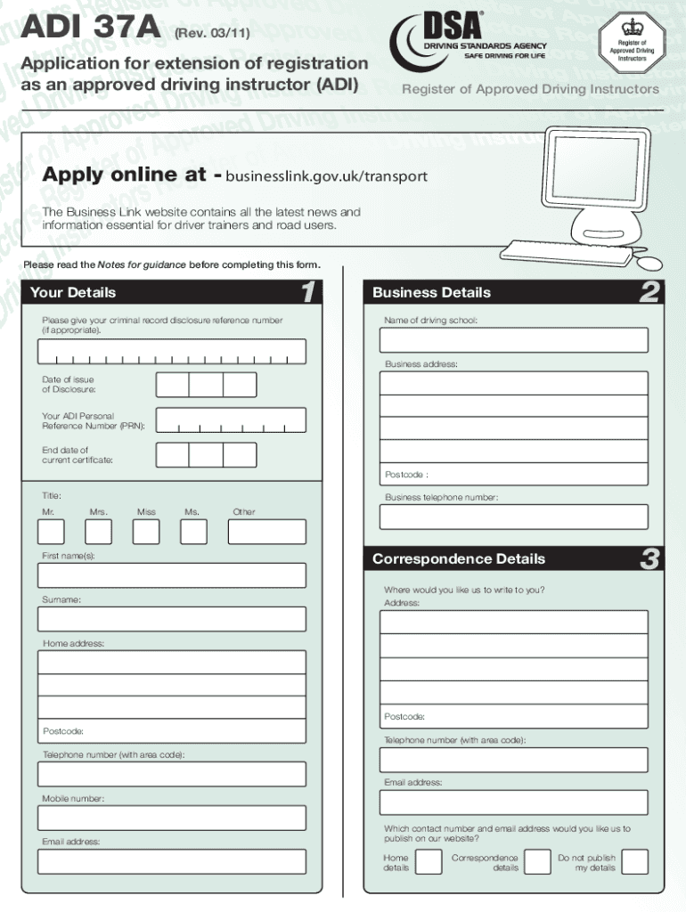 ADI 37A(Rev. 03/11)Application for extension of registration as an approved driving instructor (ADI)Register of Approved Driving InstructorsApply online at businesslink.gov.uk/transport The Business