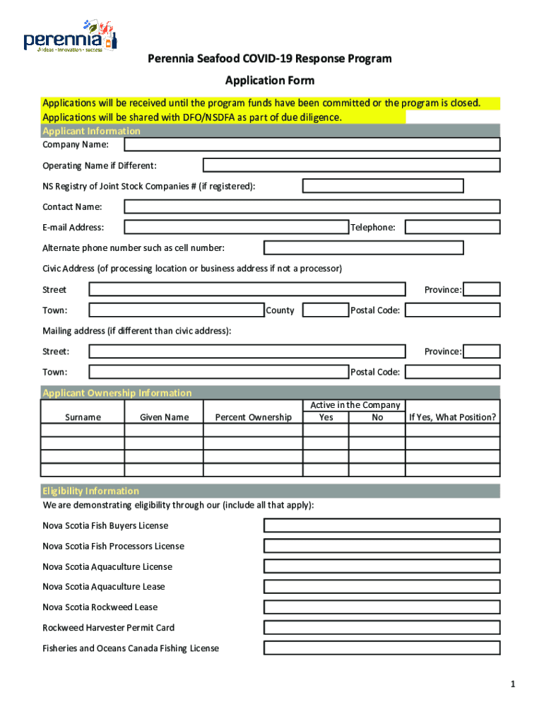 Perennial Seafood COVID-19 Response Program Application Form Applications will be received until the program funds have been committed or the program is closed. Applications will be shared with DFO/NS