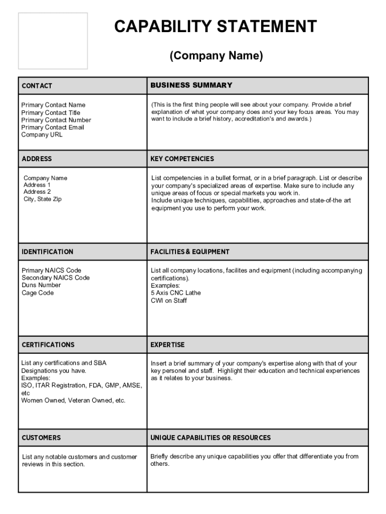 CAPABILITY STATEMENT (Company Name) CONTACTBUSINESS SUMMARYPrimary Contact Name Primary Contact Title Primary Contact Number Primary Contact Email Company URL(This is the first thing people will see