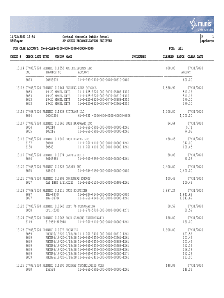 11/22/2021 12:54 5803syaw|Central Montcalm Public School |AP CHECK RECONCILIATION REGISTERED CASH ACCOUNT: TM2CASH00000000000000000000|P 1 |apchkrcn FOR:Check # CHECK DATE TYPE VENDOR NAME UNCLEARED