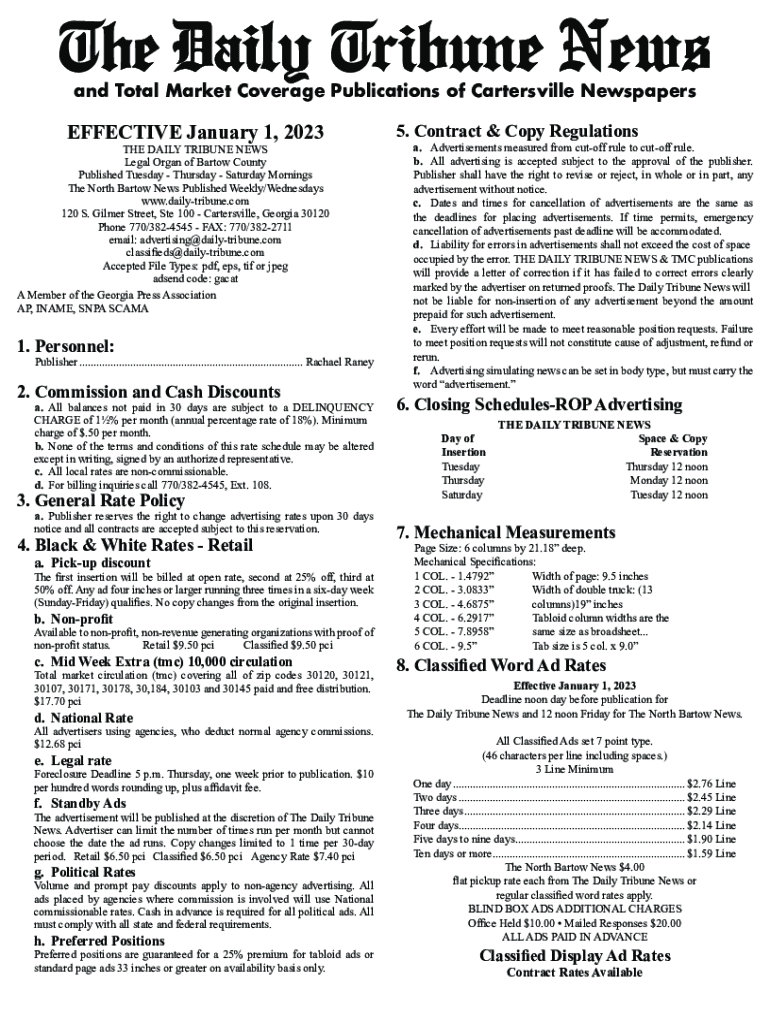 And Total Market Coverage Publications of Cartersville NewspapersEFFECTIVE January 1, 2023THE DAILY TRIBUNE NEWS