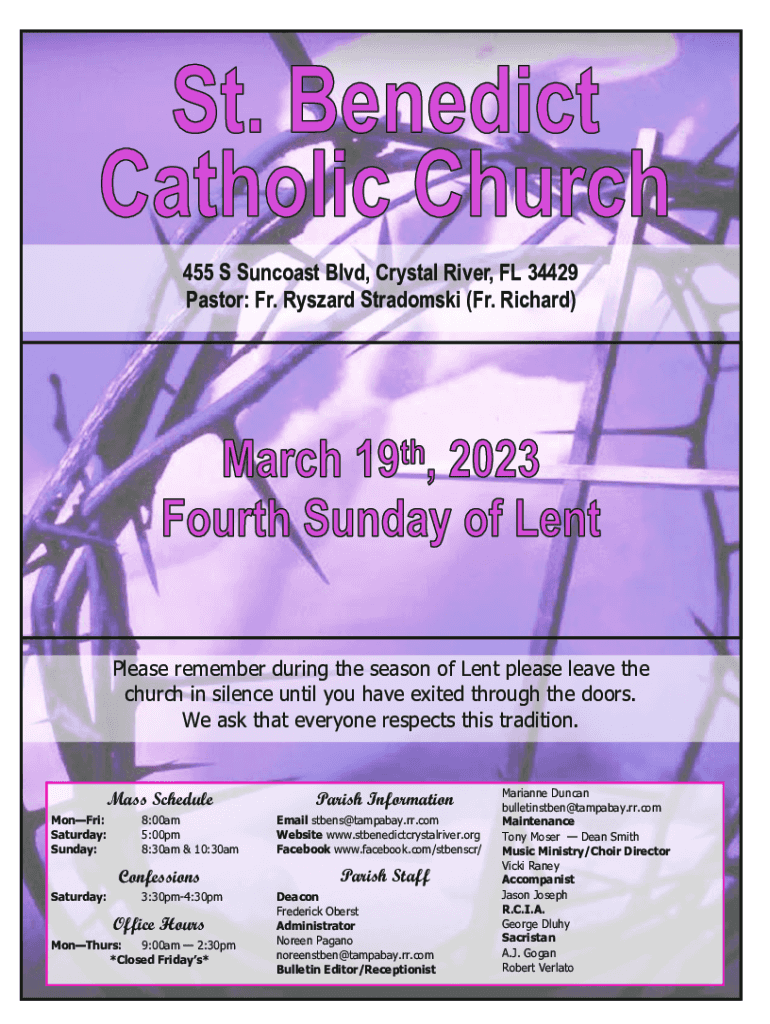 455 S Sun coast Blvd, Crystal River, FL 34429 Pastor: Fr. Richard Stradomski (Fr. Richard)Please remember during the season of Lent please leave the church in silence until you have exited through