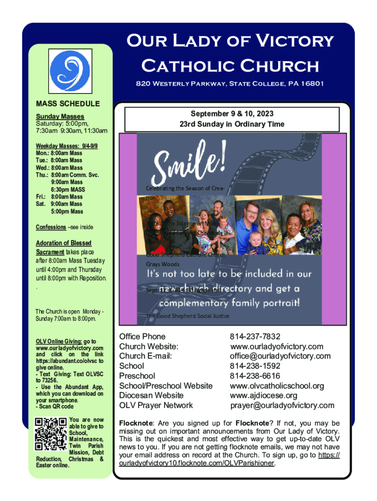 Our Lady of Victory Catholic Church 820 Westerly Parkway, State College, PA 16801MASS SCHEDULE Sunday Masses Saturday: 5:00pm, 7:30am 9:30am, 11:30am Weekday Masses: 9/49/9 Mon.: 8:00am Mass Tue.: