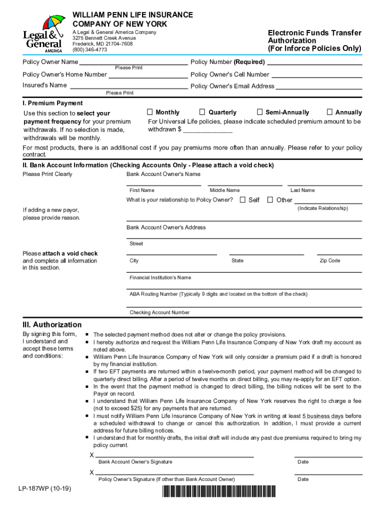 WILLIAM PENN LIFE INSURANCE COMPANY OF NEW YORK Electronic Funds Transfer Authorization (For Enforce Policies Only)A Legal & General America Company 3275 Bennett Creek Avenue Frederick, MD 217047608