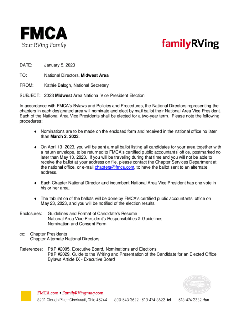 DATE:January 5, 2023TO:National Directors, Midwest Rearm:Kathie Blog, National SecretarySUBJECT: 2023 Midwest Area National Vice President Election