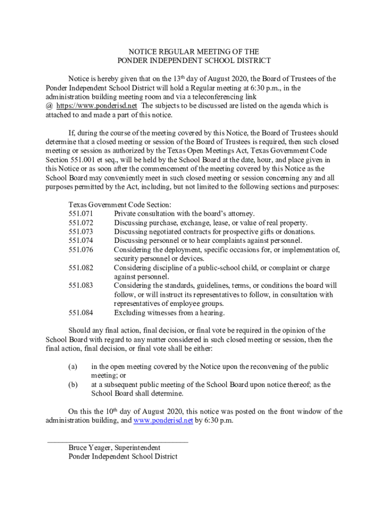 NOTICE REGULAR MEETING OF THE PONDER INDEPENDENT SCHOOL DISTRICT Notice is hereby given that on the 13th day of August 2020, the Board of Trustees of the Ponder Independent School District will hold