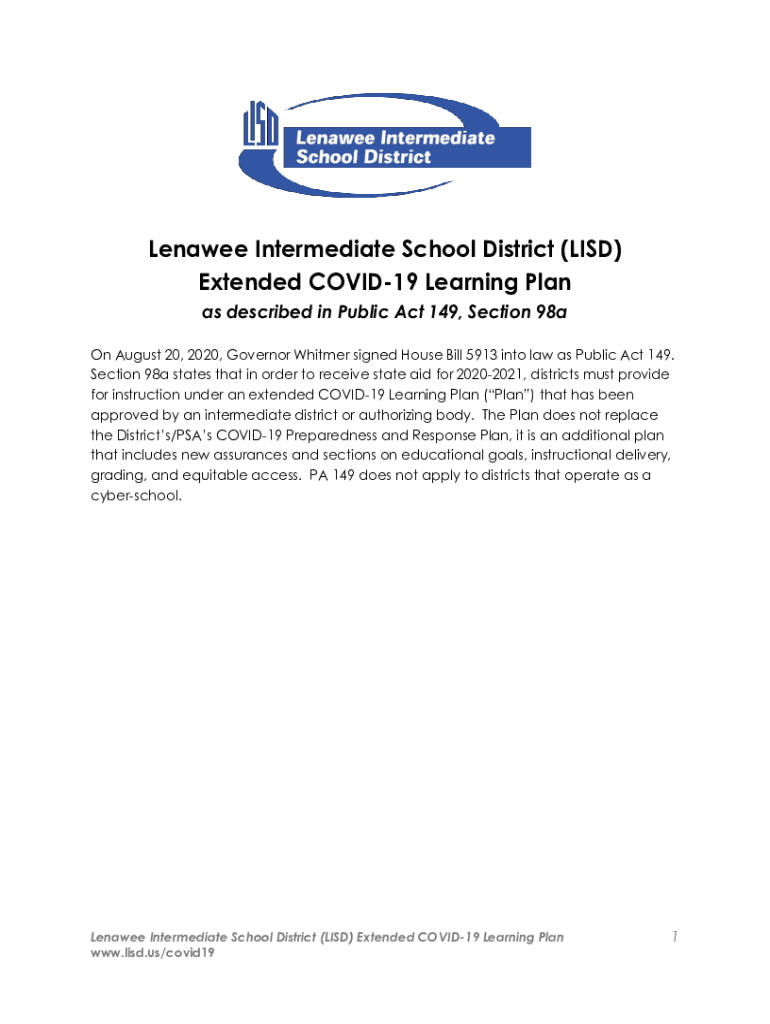 Lena wee Intermediate School District (LIST) Extended COVID-19 Learning Plan as described in Public Act 149, Section 98a On August 20, 2020, Governor Whitmer signed House Bill 5913 into law as Public
