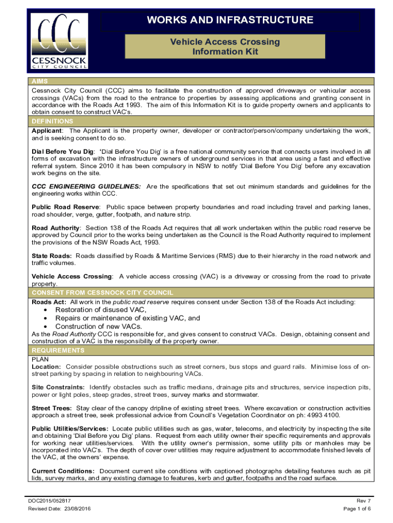 Get the free Vehicle Access Crossing Information Kit - Cessnock City Council