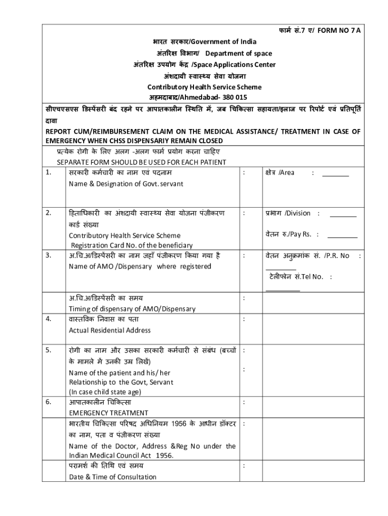 .7 / FORM NO 7 A /Government of India / Department of space /Space Applications Center Contributory Health Service Scheme /Ahmedabad 380 015