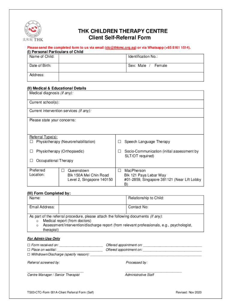 Get the free THK CHILDREN THERAPY CENTRE Client Self-Referral ...