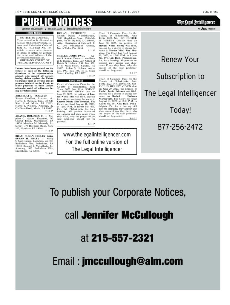 1 4 THE LEGAL L INTELLIGENCE RT UES DAY, A AUGUST 1, 2 0 2 3VOL P. 582PUBLIC NOTICES Jennifer McCullough215.557.2321ESTATE NOTICESjmccullough@alm.comDOLAN, CATHERINE