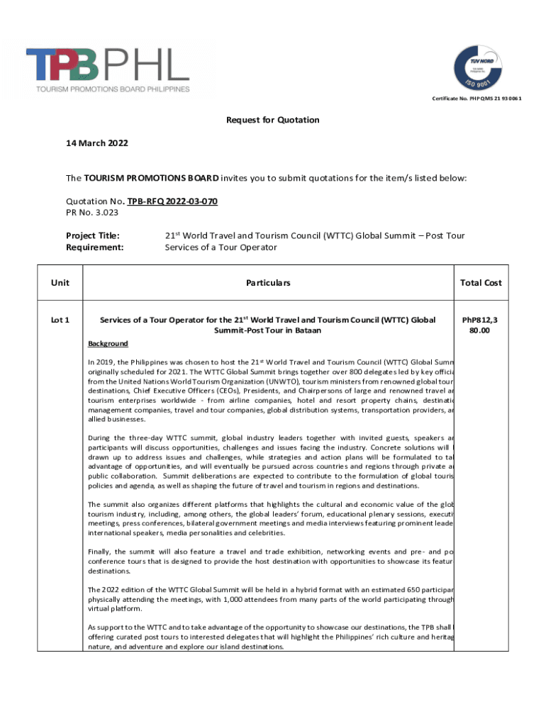 Certificate No. PHP RMS 21 93 0061Request for Quotation 14 March 2022The TOURISM PROMOTIONS BOARD invites you to submit quotations for the item/s listed below: Quotation No. TURF 202203070 PR No.
