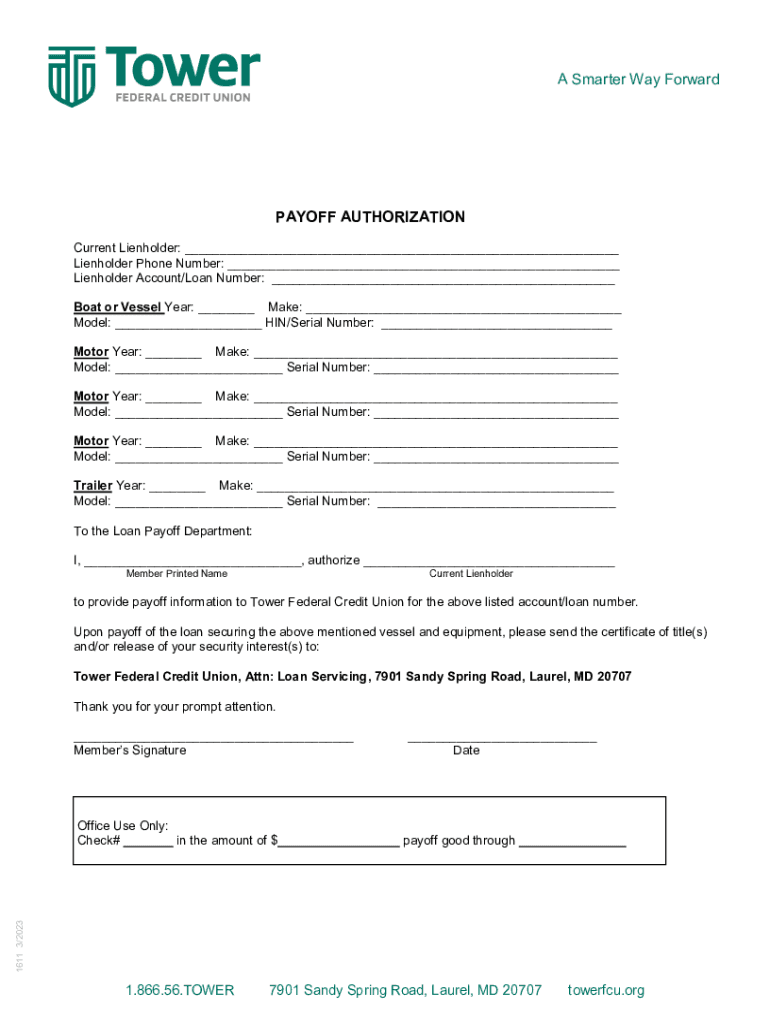 A Smarter Way ForwardPAYOFF AUTHORIZATION Current Lien holder: ___ Lien holder Phone Number: ___ Lien holder Account/Loan Number: ___ Boat or Vessel Year: ___ Make: ___ Model: ___ IN/Serial Number: