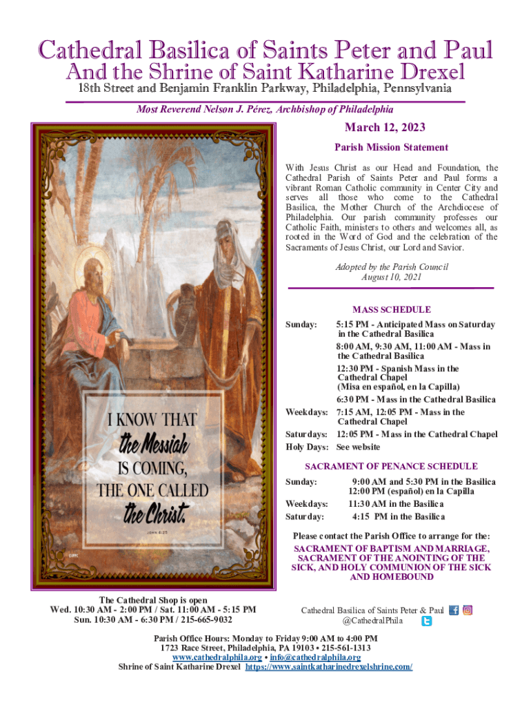 Cathedral Basilica of Saints Peter and Paul And the Shrine of Saint Katharine Drexel 18th Street and Benjamin Franklin Parkway, Philadelphia, Pennsylvania Most Reverend Nelson J. Prey, Archbishop
