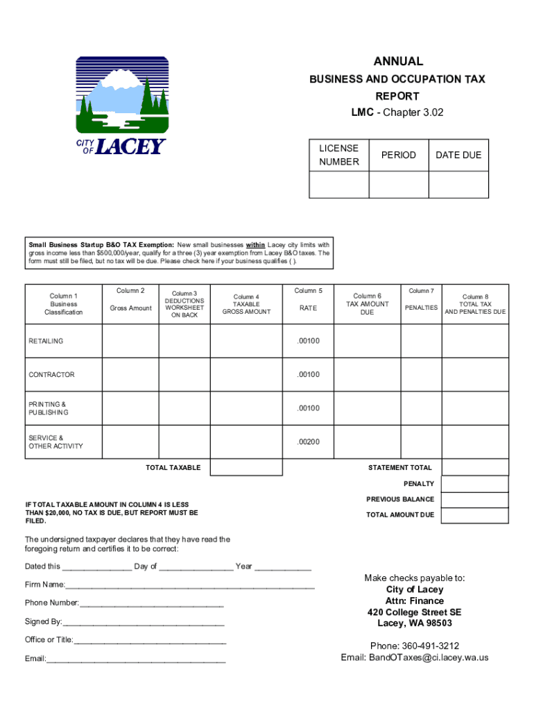 NUMBERPERIODDATE DUE Small Business Startup B&O TAX Exemption: New small businesses within Lacey city limits with
