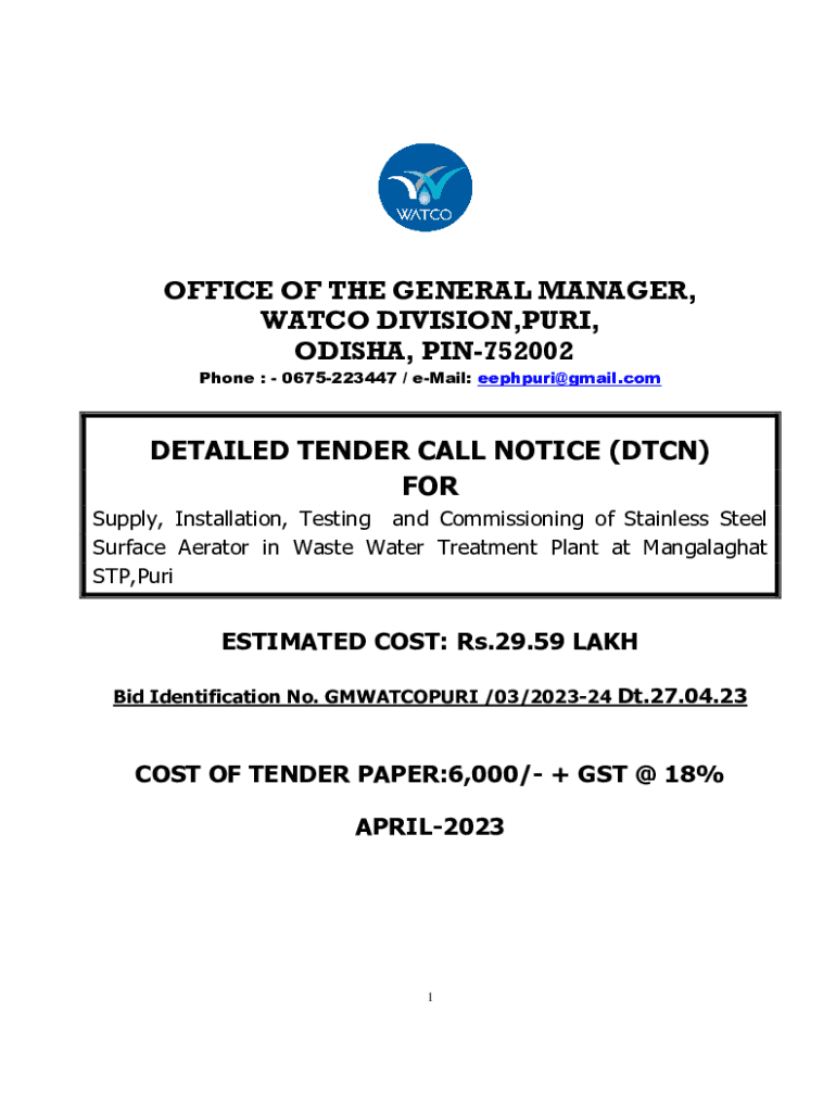 OFFICE OF THE GENERAL MANAGER, WATCH DIVISION, PURE, ODISHA, PIN752002 Phone : 0675223447 / email: eephpuri@gmail.comDETAILED TENDER CALL NOTICE (DTC) FOR Supply, Installation, Testing and Commissioning