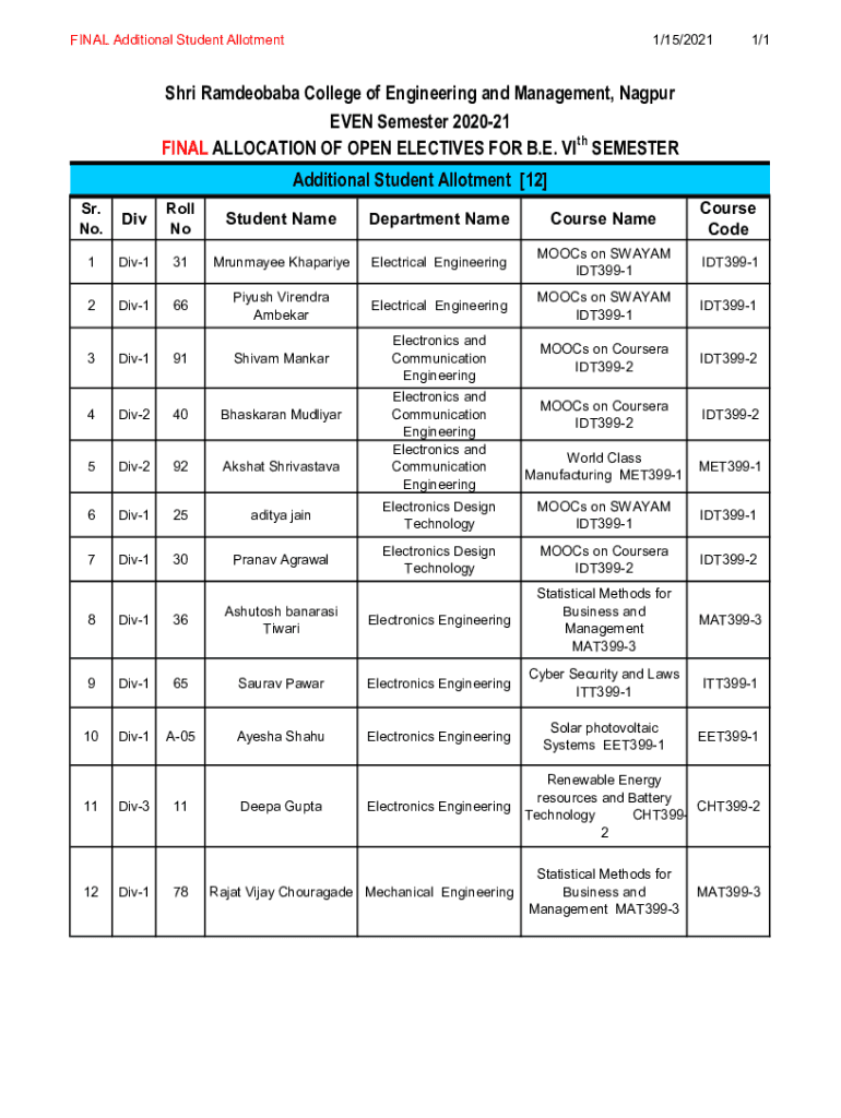 FINAL Additional Student Allotment1/15/20211/1Shri Ramdeobaba College of Engineering and Management, Nagpur EVEN Semester 202021 FINAL ALLOCATION OF OPEN ELECTIVES FOR B.E. VI TH SEMESTER Additional