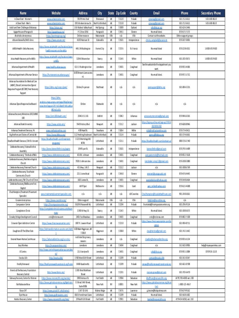 NameWebsiteAddressCityCountyEmailPhoneSecondary Phone Clean Start Women\'s A Clean Start Men\'s Adult and Teen Challenge of Arkansas Agape House of Paragould Alcoholics Anonymous Arcade Batesville/