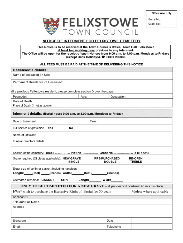 Office use only Burial No: Grant No:NOTICE OF INTERMENT FOR FELIXSTOWE CEMETERY This Notice is to be received at the Town Council\'s Office, Town Hall, Felixstowe at least two working days previous