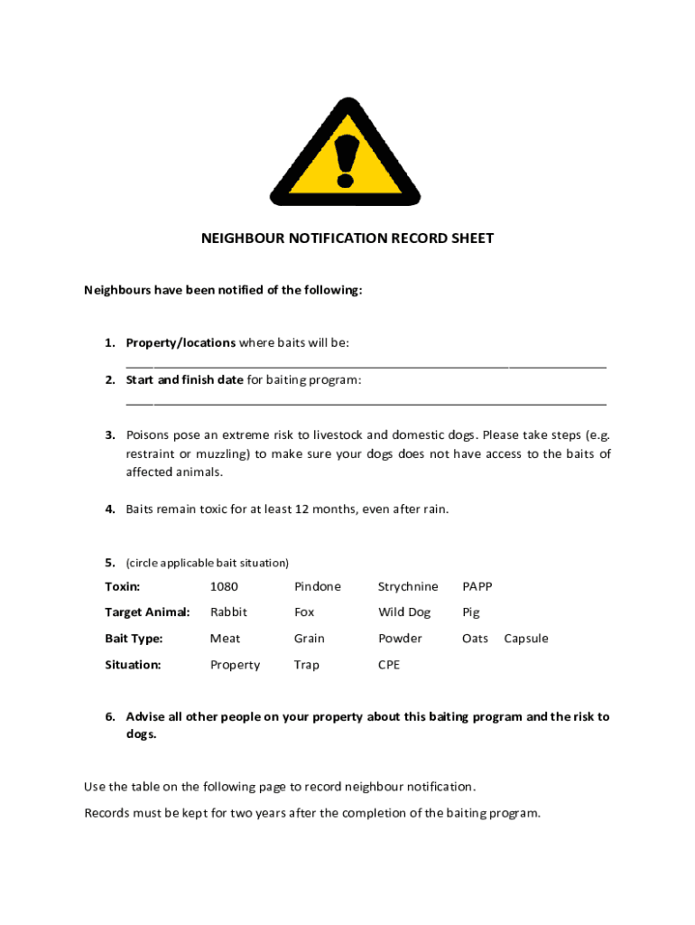 Neighbor NOTIFICATION RECORD SHEET Neighbors have been notified of the following:1. Property/locations where baits will be: ___ 2. Start and finish date for baiting program: ___ 3. Poisons pose an