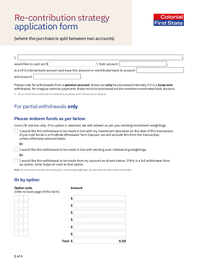 Re contribution strategy application form (where the purchase is split between two accounts)I, would like to cash out $1, from account, to a CFS internal bank account and have this amount recontributed