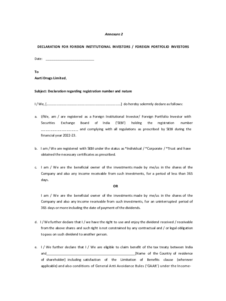 DECLARATION FOR FOREIGN INSTITUTIONAL INVESTORS / FOREIGN PORTFOLIO INVESTORS