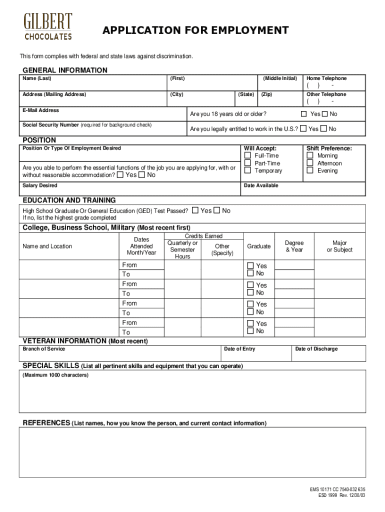 APPLICATION FOR EMPLOYMENT This form complies with federal and state laws against discrimination. GENERAL INFORMATION Name (Last)(First)(Middle Initial)Home Telephone(Address (Mailing Address)(City)(State)(Zip)Are