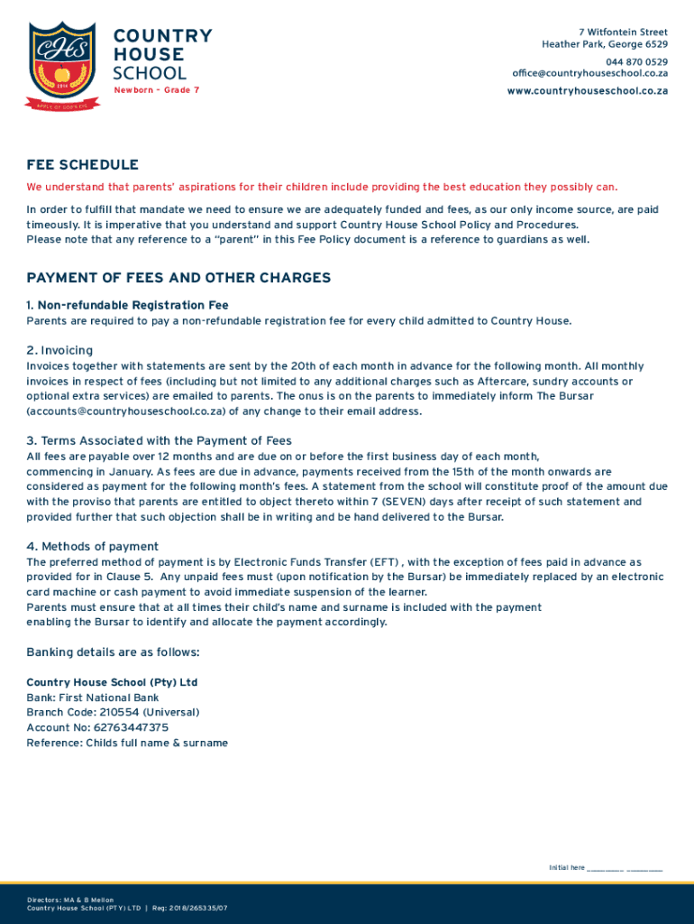 COUNTRY HOUSE Newborn Grade 7FEE SCHEDULE We understand that parents aspirations for their children include providing the best education they possibly can. In order to fulfill that mandate we need