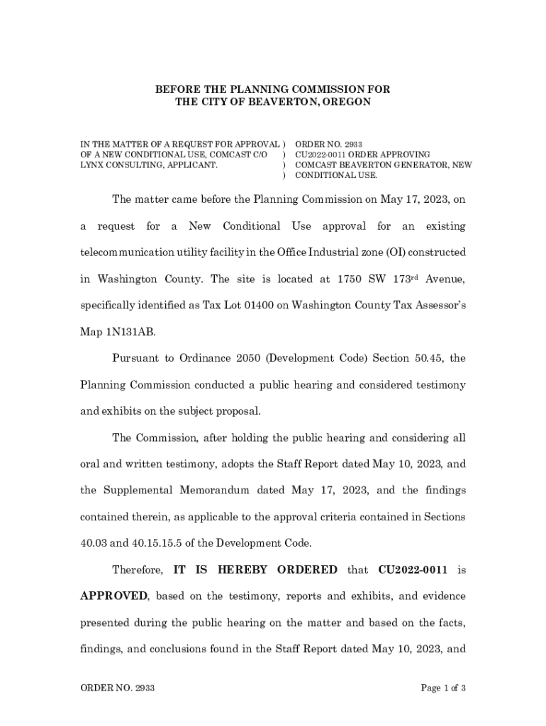 BEFORE THE PLANNING COMMISSION FOR THE CITY OF BEAVERTON, OREGONIAN THE MATTER OF A REQUEST FOR APPROVAL) OF A NEW CONDITIONAL USE, COMCAST C/O) ) LYNX CONSULTING, APPLICANT.)ORDER NO. 2933 CU20220011