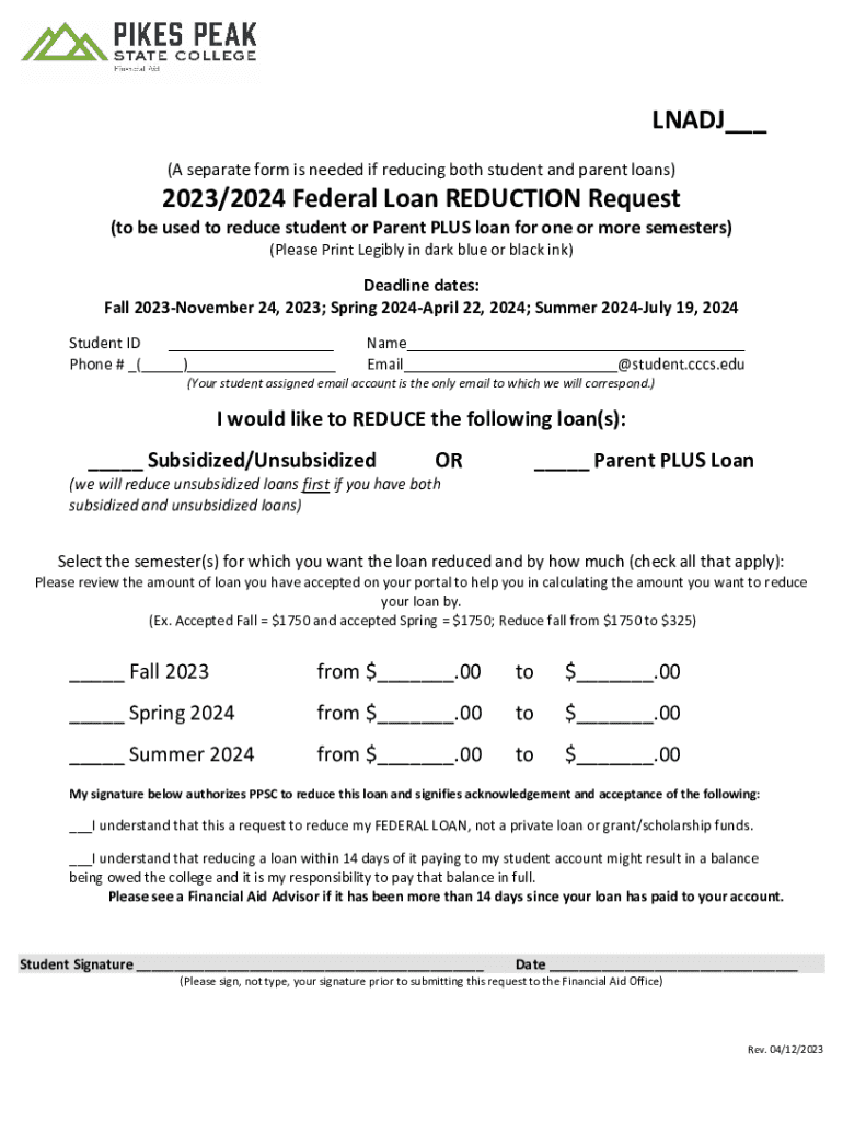 LN ADJ___ (A separate form is needed if reducing both student and parent loans)2023/2024 Federal Loan REDUCTION Request(to be used to reduce student or Parent PLUS loan for one or more semesters)