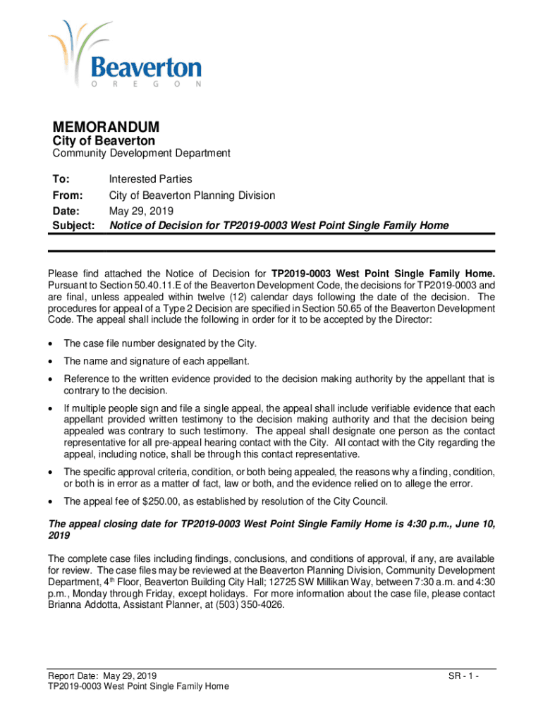MEMORANDUM City of Beaverton Community Development Department To:Interested PartiesFrom: Date: Subject:City of Beaverton Planning Division May 29, 2019, Notice of Decision for TP20190003 West Point