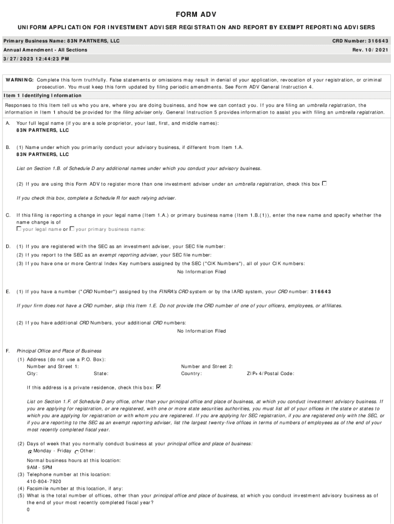 FORM ADV UNIFORM APPLICATION FOR INVESTMENT ADVISER REGISTRATION AND REPORT BY EXEMPT REPORTING ADVISERS Primary Business Name: 83 N PARTNERS, LLC CRD Number: 316643Annual Amendment All Sections