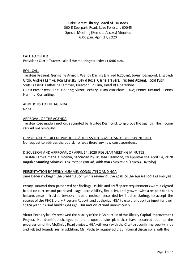 Lake Forest Library Board of Trustees 360 E Deer path Road, Lake Forest, IL 60045 Special Meeting (Remote Access) Minutes 6:00 p.m. April 27, 2020CALL TO ORDER President Carrie Travels called the