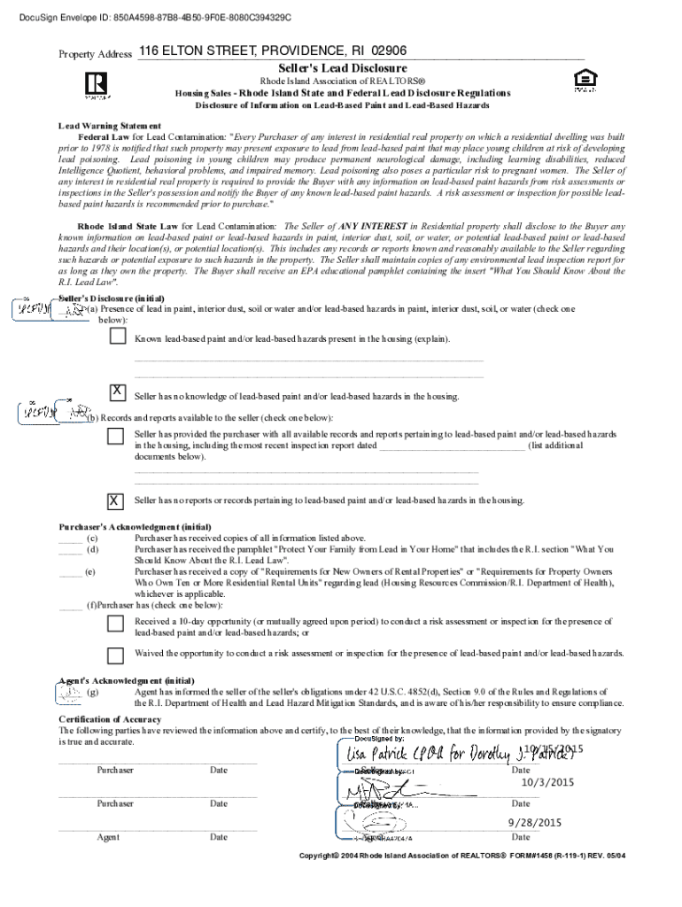 DocuSign Envelope ID: 850A459887B84B509F0E8080C394329C116 ELTON STREET, PROVIDENCE, RI 02906 Property Address ___ Seller\'s Lead Disclosure Rhode Island Association of REALTORS Housing Sales Rhode