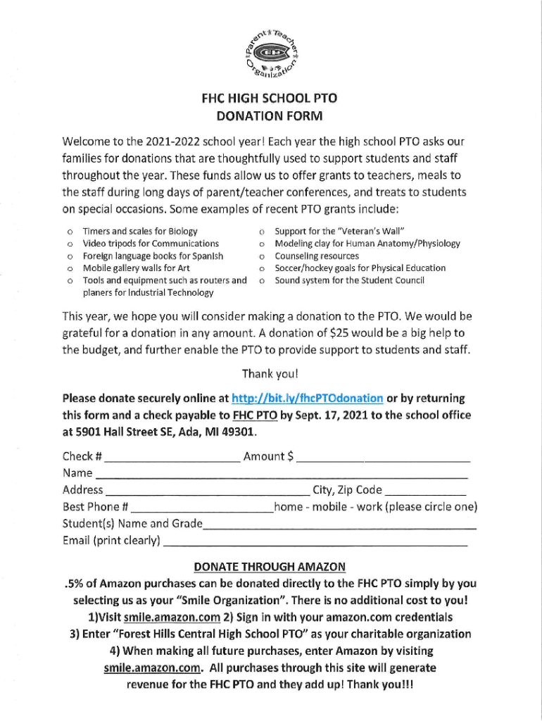 Knees % SS: Q Bod, OoSaniza%FHC HIGH SCHOOL PTO DONATION FORM Welcome to the 20212022 school year! Each year the high school PTO asks our families for donations that are thoughtfully used to support